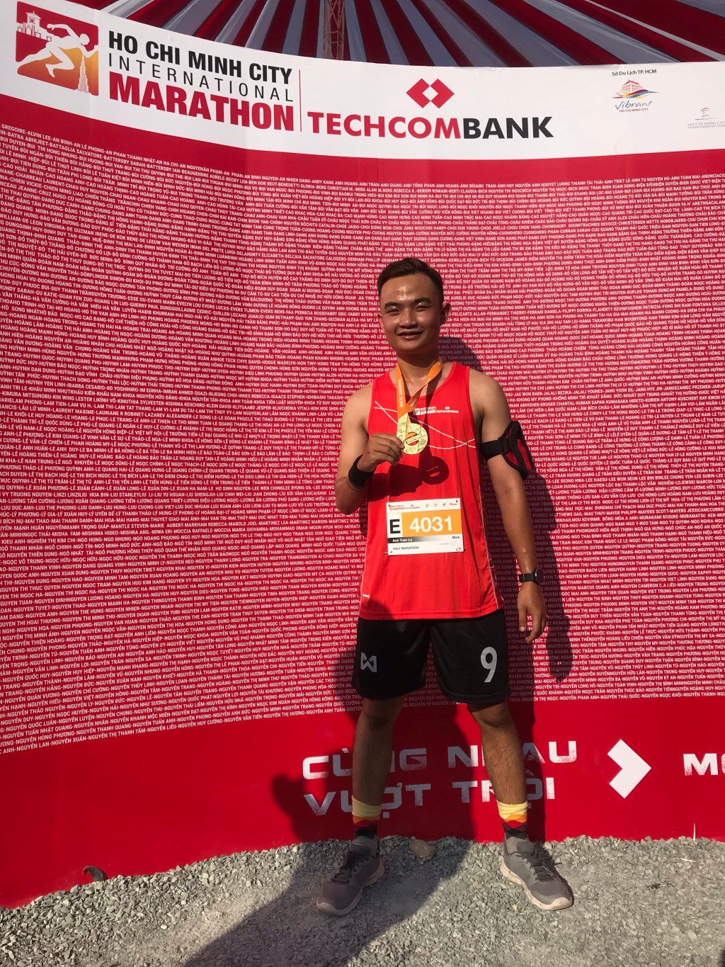 2019 này tôi bén duyên với chạy bộ một cách tình cờ, do công ty mở CLB chạy bộ nên tôi đăng ký cùng anh em cho vui, dù trước đó chưa chạy bao giờ. Là một thằng thích thể thao, môn nào tôi cũng ham vui, môn nào cũng trên trung bình – chẳng giỏi cũng chẳng quá kém. Một năm tập luyện thì ít, đăng ký liều thì nhiều. Tháng 4, tôi chạy 21km lần đầu ở Hậu Giang – dù chưa bao giờ tập chạy quá 5km, về đích 3 giờ 12 phút. Tháng 6, tôi nghĩ đã chạy thì phải lên hẳn 42km cho bõ – liền kiều đăng ký full-marathon Quy Nhơn, đi bộ về đến nơi hết 7 tiếng 13 phút. Dự kiến không chạy nữa thì lại được tặng vé Techcombank, mà đã mất công đăng ký rồi phải chọn 21km cho bõ công chạy.