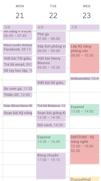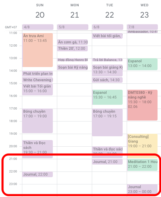 Cuối cùng mình quyết định tập trung vào Google Calendar. Một ứng dụng hoàn toàn miễn phí, có sẵn mà mình vẫn đang sử dụng hằng ngày. Google Calendar giúp mình: