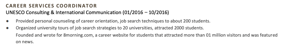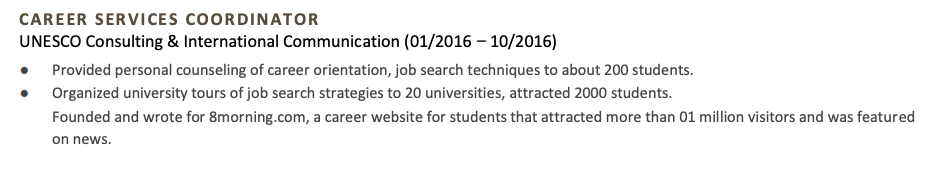 Với mỗi một kinh nghiệm bạn liệt kê trong CV, bạn cần một vài gạch đầu dòng thể hiện các công việc bạn đã làm. Tuy nhiên thể hiện bạn làm gì không là chưa đủ, bạn cần thể hiện được số liệu kết quả của công việc đó để thuyết phục người đọc.