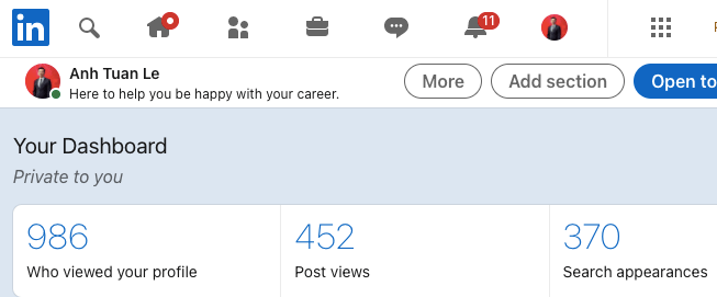 Thụ động là bạn dành thời gian xây dựng trang LinkedIn thật xịn, đầy đủ thông tin, kỹ năng, kinh nghiệm làm việc, mục tiêu tìm kiếm, có các từ khóa đắt giá để khi nhà tuyển dụng tìm ứng viên trên LinkedIn, tên bạn sẽ hiện lên trên trang tìm kiếm. Ví dụ đây là LinkedIn của Tuấn Anh: https://www.linkedin.com/in/anhtuanle234/ – thời điểm mình viết dòng này, có 986 người đã xem LinkedIn của mình trong tuần và hồ sơ của mình hiện lên trên 370 kết quả tìm kiếm.