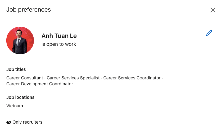Nếu bạn muốn nhà tuyển dụng tự tìm đến bạn, hãy sử dụng tính năng #OpenToWork ở đầu LinkedIn. Tính năng này cho phép chia sẻ thông tin đến các nhà tuyển dụng, và những nhà tuyển dụng nào đang xài tính năng tuyển dụng trả phí của LinkedIn sẽ dễ dàng tìm thấy bạn. Ví dụ mình đang Open To Work với vị trí Counselor chẳng hạn: