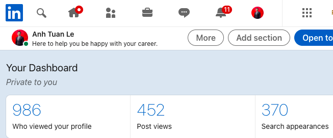 Thụ động là bạn dành thời gian xây dựng trang LinkedIn thật xịn, đầy đủ thông tin, kỹ năng, kinh nghiệm làm việc, mục tiêu tìm kiếm, có các từ khóa đắt giá để khi nhà tuyển dụng tìm ứng viên trên LinkedIn, tên bạn sẽ hiện lên trên trang tìm kiếm. Ví dụ đây là LinkedIn của Tuấn Anh: https://www.linkedin.com/in/anhtuanle234/ – thời điểm mình viết dòng này, có 986 người đã xem LinkedIn của mình trong tuần và hồ sơ của mình hiện lên trên 370 kết quả tìm kiếm.