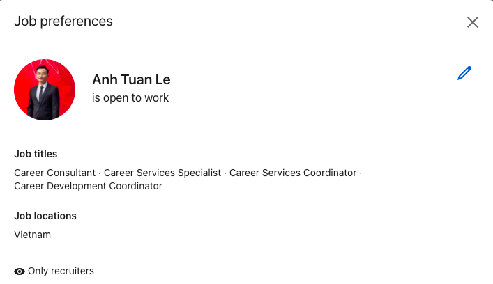 Nếu bạn muốn nhà tuyển dụng tự tìm đến bạn, hãy sử dụng tính năng #OpenToWork ở đầu LinkedIn. Tính năng này cho phép chia sẻ thông tin đến các nhà tuyển dụng, và những nhà tuyển dụng nào đang xài tính năng tuyển dụng trả phí của LinkedIn sẽ dễ dàng tìm thấy bạn. Ví dụ mình đang Open To Work với vị trí Counselor chẳng hạn: