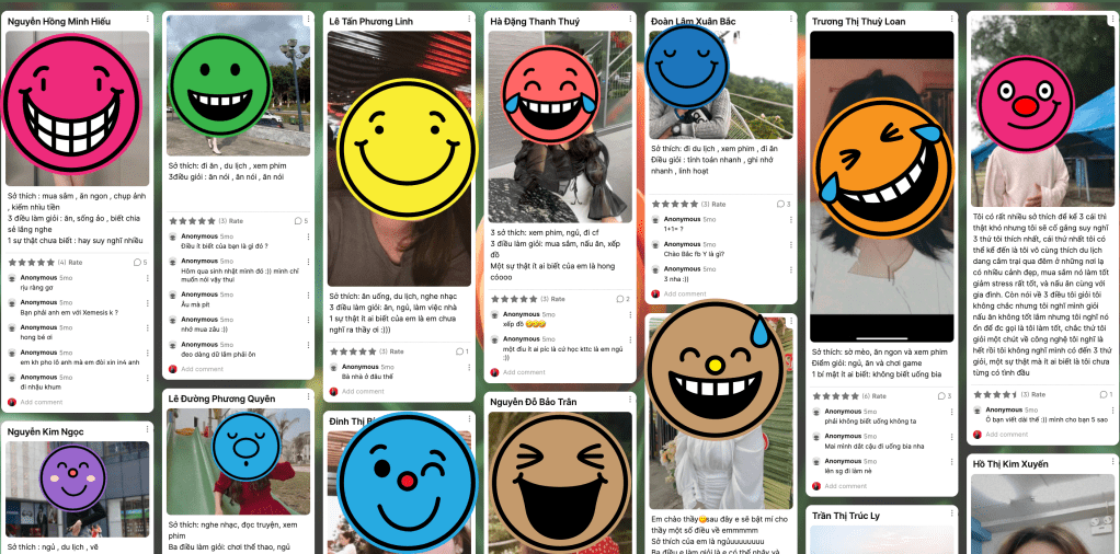 - Ứng dụng công nghệ tương tác. Gen Z thích dùng điện thoại, nên việc có các hoạt động sử dụng điện thoại tương tác với nhau sẽ thu hút các bạn. Một số website tạo hoạt động tương tác cơ bản bạn có thể nên tìm hiểu thêm là Kahoot, Slido, Padlet, Mentimeter. Ví dụ hình ảnh bên dưới là một hoạt động giới thiệu bản thân trong lớp sử dụng Padlet.