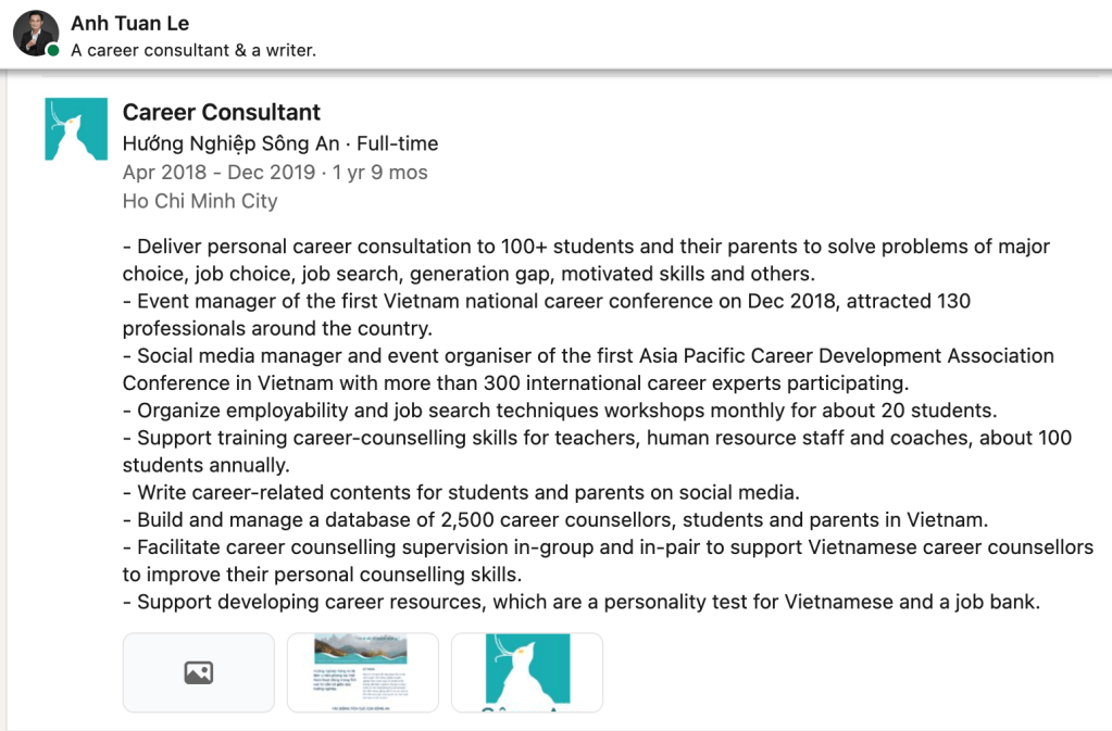 Cũng giống như CV, kinh nghiệm làm việc là một phần đa số mọi người sẽ nhìn vào và chú ý hiều nhất trong LinkedIn. Và cũng giống như CV, mình khuyến khích các bạn không viết quá dài, trọng tâm vào những ý chính và có thật nhiều số liệu kết quả công việc trong đó.