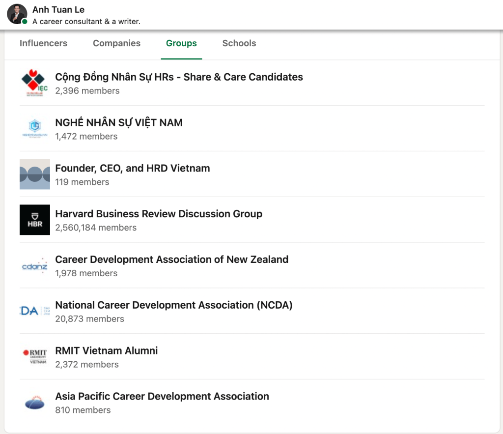Cũng giống như trên Facebook, bạn có thể tham gia vào các Nhóm (Groups) trên LinkedIn. Điểm khác ở các nhóm so với Facebook là LinkedIn tập trung sâu hơn vào các đề tài chuyên môn nghề nghiệp, vì vậy tuỳ thuộc vào ngành nghề, lĩnh vực bạn đang làm việc hoặc đang có ý định làm việc, bạn có thể tìm các từ khoá trên thanh tìm kiếm và tham gia và các nhóm nghề nghiệp đó ở cả Việt Nam và quốc tế. Nếu như nghề của bạn không có nữa thì bạn có thể tự tạo luôn ra một nhóm và mời những người đang làm cùng nghề tham gia. Ví dụ bên dưới là các nhóm hiển thị trong LinkedIn của mình, chủ yếu là về nhân sự và hướng nghiệp.