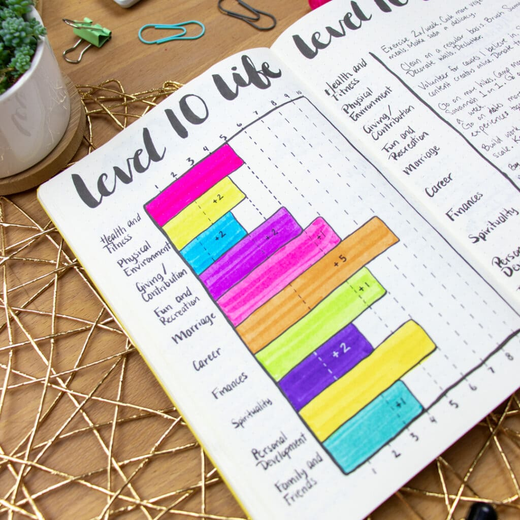 Để đánh giá điểm này, mình dùng bút màu và giấy để vẽ vời như một hình thức giải trí luôn. Sau khi chấm điểm xong, bạn có thể thử suy nghĩ xem trong tuần tới mình muốn tăng điểm mục nào, mình cần làm cái gì để tăng điểm mục đó lên cao hơn.