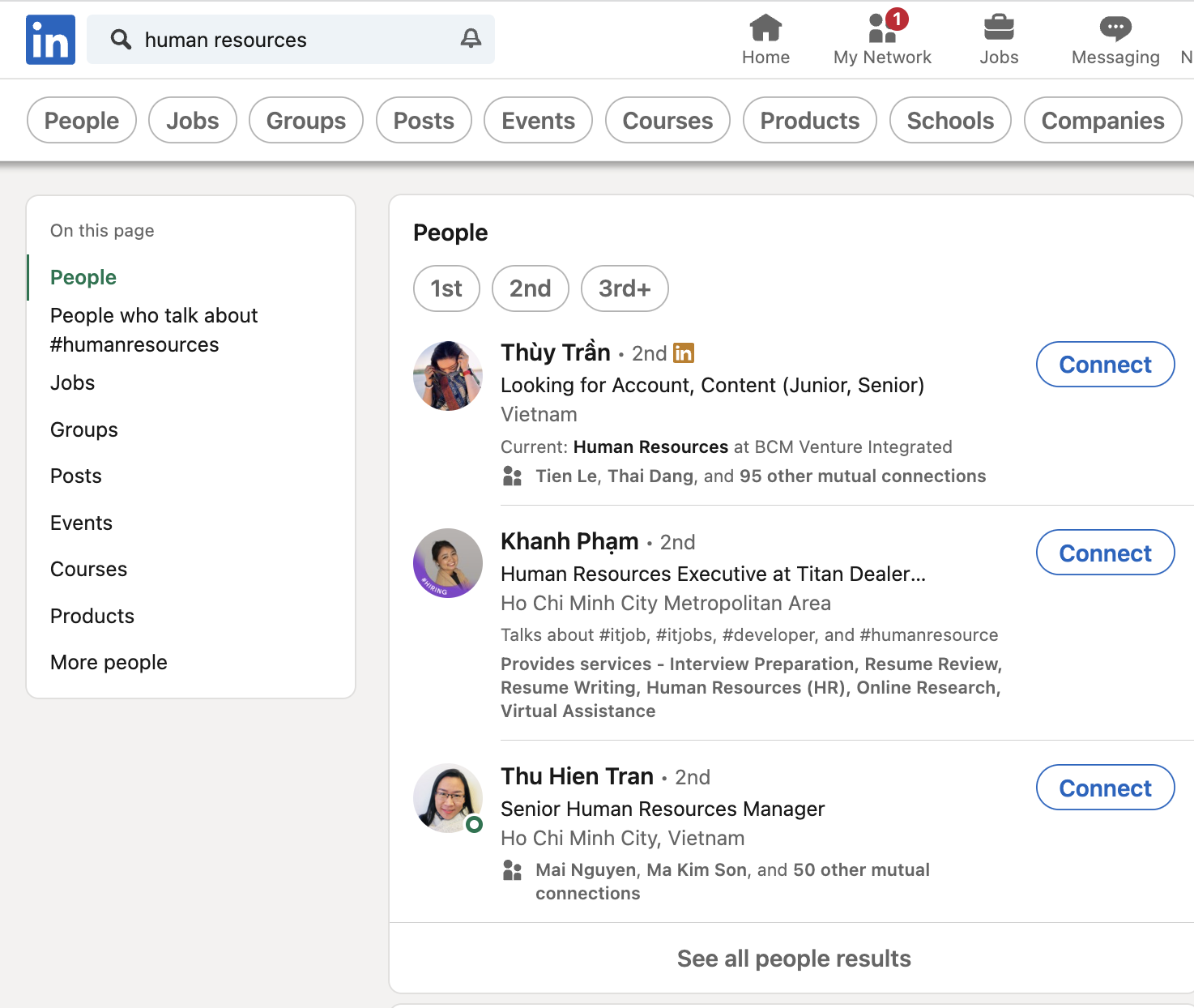 • tìm trên thanh tìm kiếm [tên vị trí] hoặc [tên lĩnh vực] mà bạn đang hướng tới. Ví dụ bạn đang muốn làm nhân sự, bạn tìm [human resource] để cho ra những người đang làm công việc đó có profile LinkedIn và kết nối.
