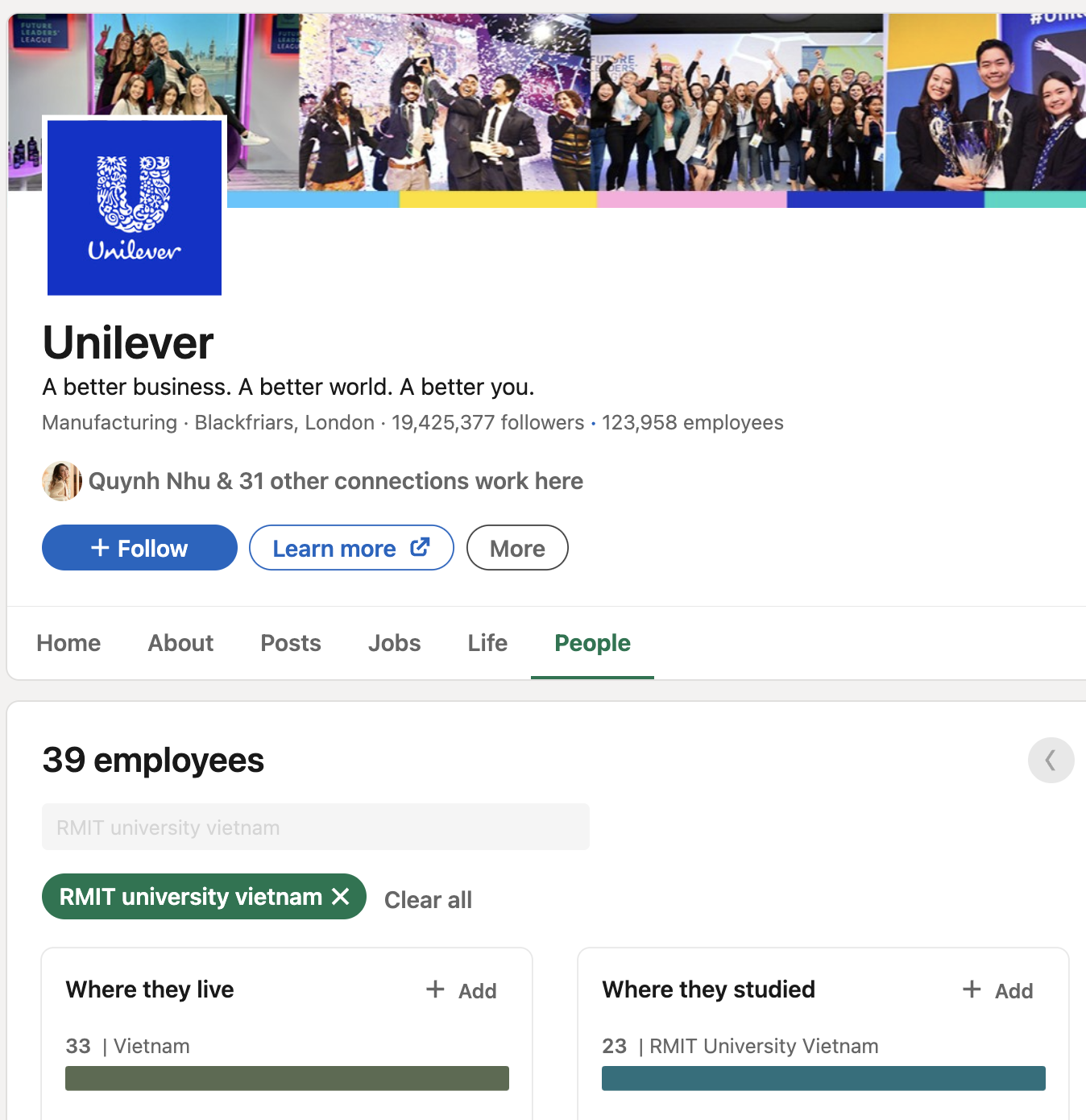 • một cách khác là bạn tìm [tên công ty] bạn đang quan tâm, sau đó ấn vào page công ty đó, vào phần People. Tại đây bạn có thể gõ [tên vị trí] để tìm ra những người làm ở vị trí đó trông công ty đó, hoặc gõ [tên trường bạn học] để tìm ra những cựu sinh viên trường mình đang làm ở công ty đó và kết nối. Ví dụ mình tìm những người học RMIT đang làm ở Unilever quốc tế thì ra 30 người
