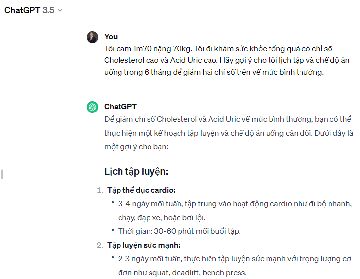 Việc bạn cần làm bây giờ là thử rà soát xem trong cuộc sống và công việc hàng ngày từ khi mở mắt ra đến khi đi ngủ, mình có đang ứng dụng công nghệ AI vào việc gì không? Nếu không, mình có thể thử ứng dụng làm gì không? Ví dụ, bạn có thể cho ChatGPT biết về thực trạng sức khỏe và mục tiêu sức khỏe, từ đó ChatGPT có thể lên cho bạn lịch tập và ăn uống (xem hình bên dưới).