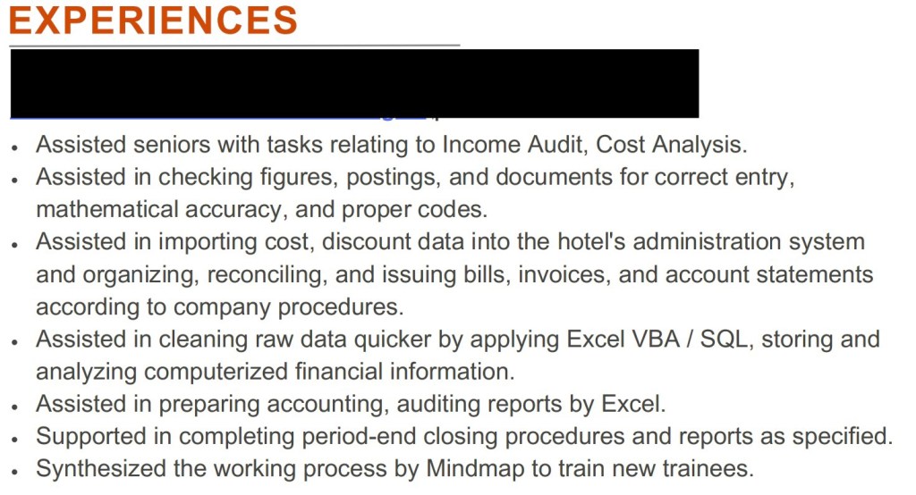 Một vấn đề nhỏ trong CV của các bạn ở Việt Nam khi viết tiếng Anh mà mình thường gặp đó là “lặp từ”. Do vốn tiếng Anh có hạn cũng như do khiêm tốn, các bạn Việt Nam mình dễ bị lặp các từ như “Take”, “Support”, “Assist” khi viết các gạch đầu dòng trong CV. Ví dụ như bên dưới: