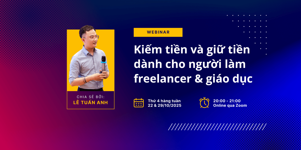 Mình thiết kế chuỗi webinar này để chia sẻ lại kinh nghiệm thật, những điều mình đã thử, đã sai, và đã tìm ra cách vận hành tài chính ổn định như một “doanh nghiệp một người”.